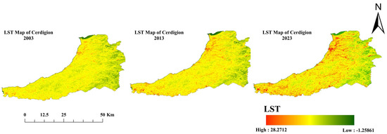 Figure 4 illustrates changes in land surface temperature (LST) in Ceredigion County over the last two decades, covering the years 2003, 2013, and 2023. The data reveal a clear upward trend in temperature extremes, reflecting the combined influences of climate change, urban expansion, and land use change. In 2003, the county-wide mean LST was approximately 21.4 °C, with a maximum of 26.0 °C and a minimum of 17.0 °C (see Table 4). By 2013, the mean had increased to 22.5 °C, and the maximum reached 27.0 °C, indicating a gradual warming trend. The most significant rise occurred by 2023, when the county-wide mean LST reached 23.65 °C, while urban areas averaged as high as 27.1 °C, and maximum county-wide temperatures peaked at 28.27 °C.