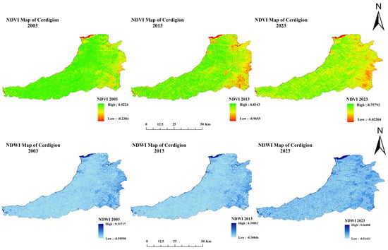 NDVI and NDWI map of three epochs: 2003, 2013, and 2023 (Source: Author).