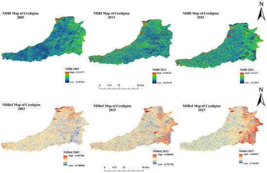 NDBI and NDBaI map of three epochs: 2003, 2013, and 2023.