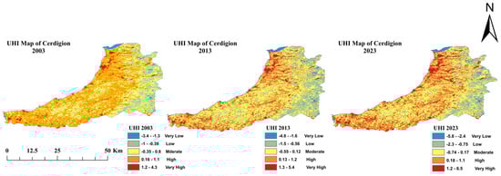 UHI map of three epochs: 2003, 2013, and 2023 (Source: Author).