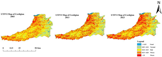UTFVI map of three epochs: 2003, 2013, and 2023 (Source: Author).