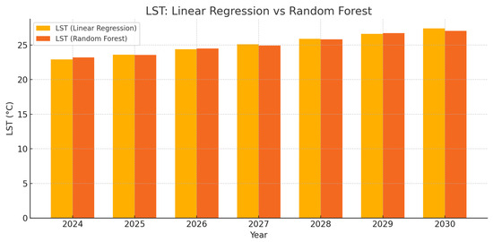 Comparison of predicted LST values using Linear Regression and Random Forest for 2024–2030.