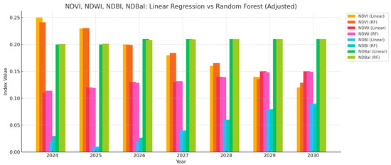 Predicted values of NDVI, NDWI, NDBI, and NDBaI from 2024 to 2030 using Linear Regression and Random Forest models.