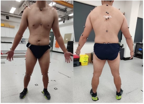 A 12-camera Vicon Vero v2.2. three-dimensional motion capture system (Vicon MX, Oxford, UK) was used to track the motions of body segments for movement analysis due to their excellent reliability (ICC = 0.9; SEM = 1.9 degrees) in terms of dynamic upper-limb motion, including push-ups []. A total of 44 passive reflective markers were attached to the participant on key body landmarks, defining the joint coordinate system based on the International Society of Biomechanics Recommendations []. Based on previous studies [], three additional clusters of four markers were attached to the acromion and interscapular region to track kinematics more accurately (Figure 1). The 56 markers are located as follows: