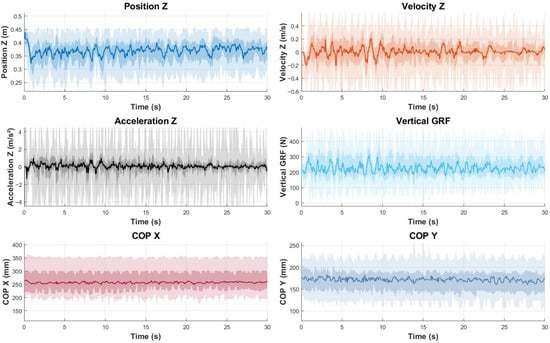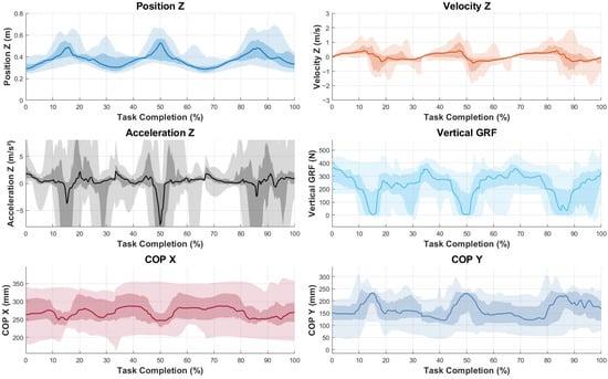 A graphical summary of the main variables assessed by force plates and motion capture systems is presented in Figure 2 and Figure 3. The line represents the median value of the entire sample for each variable across time, while the shading indicates the envelopes. Concretely, lighter shading shows the full envelope of the data, ranging from maximum to minimum values at each time point, while darker shading indicates the interquartile range, from the 25th percentile to the 75th percentile, to highlight that the middle 50% of the data lies within.