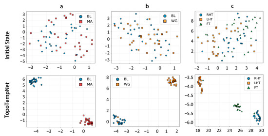 t-SNE visualizations of different datasets: (a) MA dataset, (b) WG dataset, and (c) UFFT dataset.