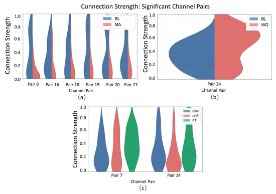 As shown in the violin plot of connectivity strength (Figure 6), distinct distribution patterns are observed across significant channel pairs in the MA (mental arithmetic), WG (word generation imagination), and UFFT (motor imagery) datasets. In certain channel pairs, the connectivity strength of the MA group is concentrated in the mid-to-high range, whereas the WG group shows a greater spread in the lower range. The UFFT group, on the other hand, exhibits unique distribution patterns in some channel pairs, differing from the other two. These findings suggest that the degree of inter-channel connectivity varies in a task-specific manner, reflecting potentially distinct neural cooperation mechanisms underlying different cognitive processes such as calculation, language generation, and motor imagery.