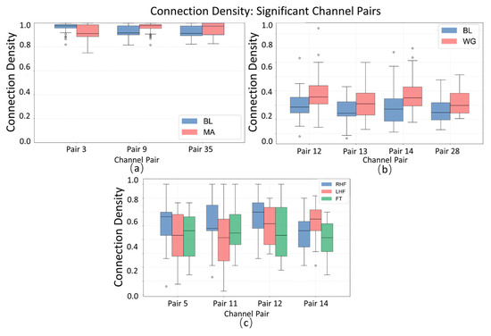 The boxplot of connectivity density (Figure 7) reveals the dispersion and central tendency of significant channel pairs across the MA (mental arithmetic), WG (word generation imagination), and UFFT (motor imagery) groups. In certain channel pairs, the MA group shows notable differences in median and interquartile range compared to the WG and UFFT groups, indicating a task-specific pattern of “connectivity activity frequency” in the corresponding brain regions during mental arithmetic. Additionally, the distribution of outliers varies among groups—MA exhibits more extreme high values in some channel pairs, which may suggest that the mental arithmetic task elicits statistically significant, high-frequency atypical connections in specific brain regions. Meanwhile, the density characteristics observed in the WG and UFFT groups also align with their respective task-related neural mechanisms.