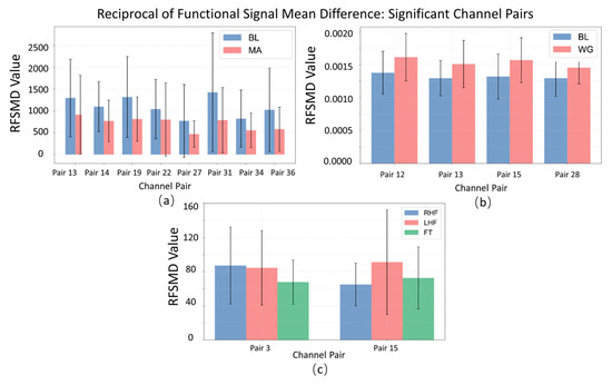 The bar chart with error bars (Figure 8), representing the mean and standard deviation, illustrates clear differences in Reciprocal of Functional Signal Mean Difference (RFSMD) across significant channel pairs for the MA (mental arithmetic), WG (word generation imagination), and UFFT (motor imagery) groups. In certain channel pairs, the MA group shows higher average RFSMD values compared to the others, suggesting more efficient signal transmission and faster neural information integration in the corresponding brain regions during mental arithmetic. The WG group, on the other hand, exhibits lower average RFSMD values in some channel pairs, indicating that information flow may be less efficient under the word generation task, reflecting a distinct neural routing pattern. For the UFFT group, the observed RFSMD features align with the hypothesis that motor imagery requires rapid integration into motor-related regions (evidenced by relatively high RFSMD values in motor cortex-associated channel pairs), but may involve varying transmission efficiencies across different areas (reflected by uneven RFSMD distributions). Additionally, differences in the lengths of error bars between groups reflect variability in neural activity—shorter error bars in some MA group channel pairs suggest more consistent RFSMD values across individuals, indicating a relatively stable neural activation pattern during mental arithmetic.