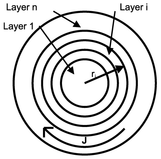 The analyzed coil is an infinitely long cylinder with air core and concentric conductive layers with air gap between them. The layer conductors consist of a linear, homogeneous, and isotropic material. The properties of the i-th layer are σi (conductivity), μi (magnetic permeability), and εi (electric permittivity), and its external radius is ri, as shown in Figure 1. The harmonic dependence exp (jωt) of all field quantities is assumed.
