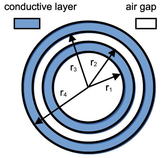 The above theory was used to determine the real component of the coil’s impedance. The developed coil contained an air core and two conductive layers separated by an air gap. Therefore, the considered coil model consists of a total of four layers: the air core, the first (inner) conductive layer, the air gap, and the second (outer) conductive layer; see Figure 2.