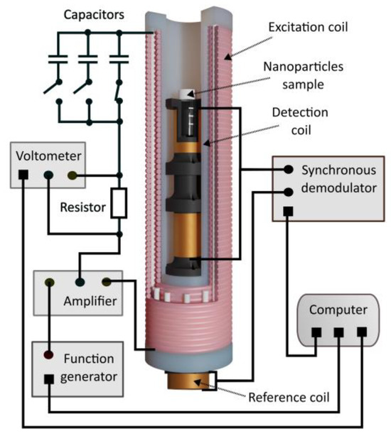 The developed hybrid system for the magnetic characterization of superparamagnetic nanoparticles consists of an excitation coil and two sensing probes [26]. The excitation coil has been designed as a double-layer coil with 122 turns, wound at a distance of 200 mm, with 61 turns in each layer. Figure 5 shows the schematic diagram of the system used to measure the series resistance of the excitation coil.