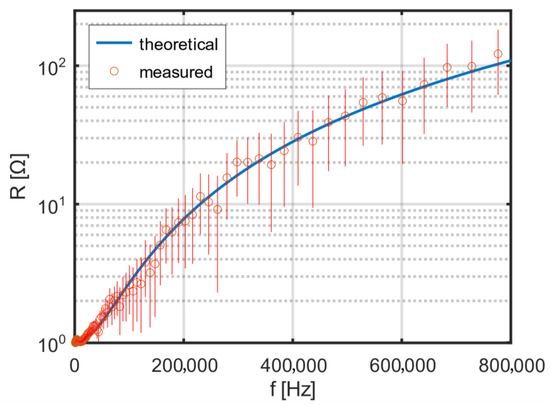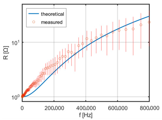 Normalization was used for the calculations—the factor was calculated according to the formula above and then divided by the factor computed for a frequency close to zero. To fit the theoretical resistance curves to the measured ones, an effective strand diameter equal to was used, where is a correction factor determined experimentally.