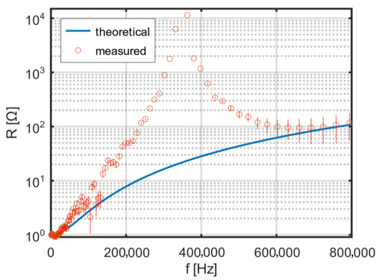 To shift the resonant frequency upward, so that it clearly exceeds 800 kHz, a spacing of 3.5 mm was introduced between the two layers. The theoretical and measured frequency dependence of the resistance of the two-layer coil with additional spacing is shown in Figure 9. In the intended operating range of the excitation coil, no resonance is visible.