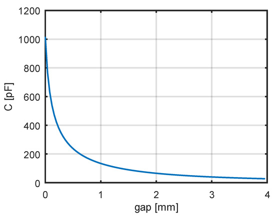 The theoretical dependence with a correction factor of 0.8 shows good agreement with the measurement results. One of the factors affecting the resonant frequency of the coil is its stray (parasitic) capacitance. For the adopted model of a two-layer coil, it was decided to reduce this capacitance by introducing a gap between the layers. Using the theoretical relationships (38)–(42), the dependence of the coil’s stray capacitance on the additional spacing between the two winding layers was calculated. The results of the calculations are shown in Figure 10.