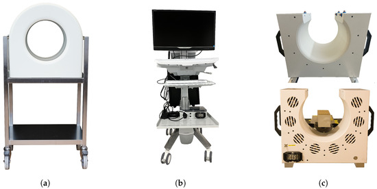 Components of the PET system: (a) Front view of the ICU scanner-trolley. (b) Operator’s trolley, containing the computer for image reconstruction and the 24 power supply for the scanner. (c) PBT scanner, featuring an opening for proton irradiation. The top image shows the scanner viewed from the front, and the bottom image shows it viewed from the back.