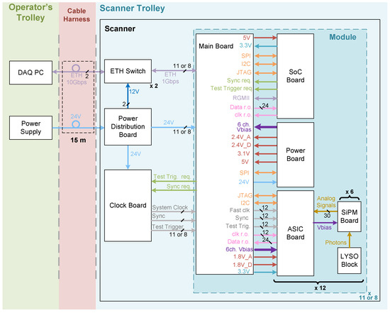 - Two commercial Ethernet (ETH) switches (Netgear GS110MX, Netgear, San Jose, CA, USA) which interconnect the modules and the DAQ computer located at the operator’s trolley.