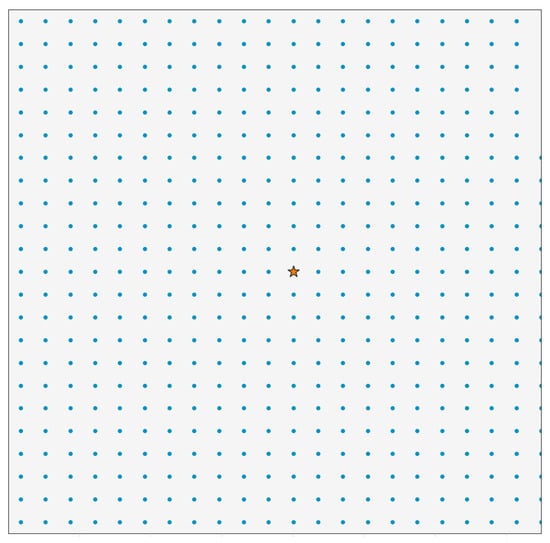 2 (4 × 4 km) coverage area with a single gateway positioned at the centre. As shown in the figure, the sensor nodes are uniformly distributed throughout the area. The evaluation of a representative range of these fixed densities enabled the exploration of performance boundaries and trends that are relevant across a variety of deployment scenarios, including mixed environments.