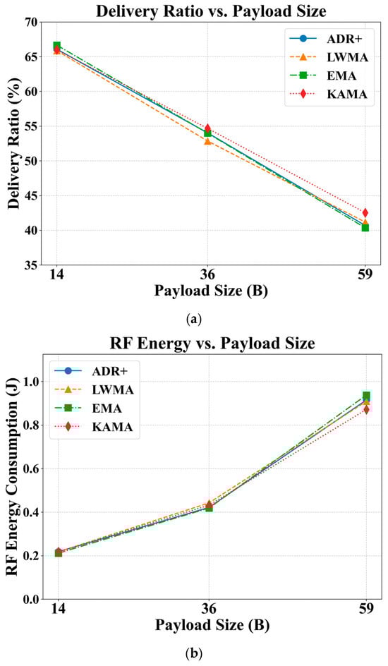 Figure 7b shows that the RFEC increases with payload size, with this effect becoming more pronounced at higher payloads. Specifically, a consumption of approximately 10 mJ per byte is observed when the payload increases from 14 to 36 bytes, while this rises to approximately 20 mJ per byte for the increase from 36 to 59 bytes. Comparatively, KAMA consistently offers a better RFEC, achieving a reduction in energy consumption of between 40 and 70 mJ as the payload increases from 14 to 59 bytes. Although the findings generally indicate that the payload size has significant adverse effects on both the DR and RFEC, they also demonstrate that KAMA remains a promising algorithm across a wide range of payload conditions.
