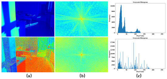 Comparison of pixel frequency distribution histograms and spectrograms between intensity and HV color maps. Among them, (a) represents the intensity map (above) and the HV color map (below), (b) represents the spectrogram and corresponds one-to-one with (a), and (c) represents the histogram of pixel value frequency distribution and corresponds one-to-one with (a).