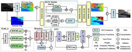 As shown in Figure 2, we convert the RGB color space to the HVI color space and apply a denoising task to the HV branch and an enhancement task to the I branch. The input of the HV branch combines the intensity map and HV color map, as the brightness component of extremely low-light images also contains noise []. Furthermore, unlike CIDNet [], which lacks explicit denoising and enhancement modules, our approach achieves more refined processing through two key modules: the MSGD module performs denoising on the color branch in a strong-preservation manner, while the LFIE module enables targeted enhancement by decoupling the low- and high-frequency components of the illumination. The specific details of these modules are described in more detail below.