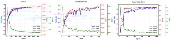 We trained our U-net-based [] DLFE-Net using a single RTX 4090 GPU. In terms of the optimizer, we chose the Adam optimizer [] and set the learning rate to . Then, during the training process, we gradually reduced it to  through a cosine annealing scheme []. In terms of weight setting for the loss function, for the LOLv1 and LOLv2-synthetic datasets, we set weights of 1.00, 200.00, and 0.01 for SSIM loss [], edge loss [], and perceptual loss [], respectively. For the LOLv2-real and Sony-Total-Dark datasets, we only set weights of 0.01 for perceptual loss. For the SICE dataset, we set weights of 50.00 and 0.01 for edge loss and perceptual loss, respectively. In addition, we used gamma correction to train the model on the SICE dataset. As shown in Figure 3, we provide the variation of model performance with the number of training rounds on the LOLv1, LOLv2-synthetic, and Sony-Total-Dark datasets.