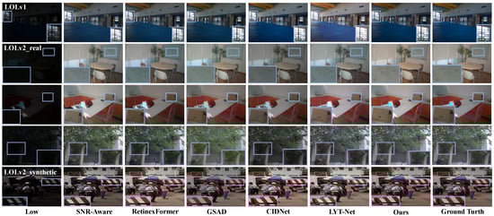 Visual comparisons of enhancement results by using different methods: SNR-Aware [], RetinexFormer [], GSAD [], CIDNet [], and LYT-Net [] on the LOLv1, LOLv2-real, and LOLv2-synthetic datasets.