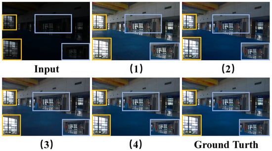 Visual comparisons of enhancement results by using four ablation experiments on the LOLv1 dataset. Among them, (1), (2), (3), and (4) correspond one-to-one with Table 4.