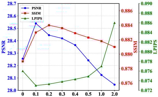 Residual Contribution Ratio. As shown in Figure 2, in the LFIE module, we set a reduction coefficient to control the contribution of the residual part. By changing this value, the model can achieve different effects. As shown in Figure 7, as the residual contribution ratio increases, the values of all evaluation indicators first become better and then worse. This is because the residual part contains a lot of high-frequency information, which includes texture features, edge details, and noise in the intensity map []. If the residual is appropriately introduced, it can effectively compensate for the loss of image details after low-frequency separation. However, if the residual is excessively introduced, on the one hand, it will amplify the noise of the image, and on the other hand, it will suppress the processed low-frequency information with high-frequency information. At the same time, if the residual part is completely discarded, it is equivalent to losing some of the detailed information of the image, and the evaluation index will also significantly decrease. After considering all evaluation indicators comprehensively, we chose 0.1 as the reduction coefficient.