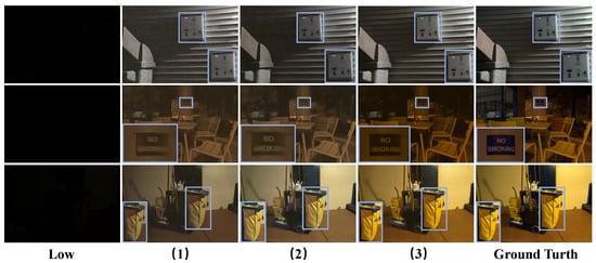 Visual comparisons of enhancement results by using different denoising methods on the Sony-Total-Dark dataset. Among them, (1), (2), and (3) correspond one-to-one with Table 7.