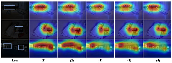 Comparison of heatmaps with different dilation rates on the LOLv1 dataset. Among them, (1), (2), (3), (4), and (5) correspond one-to-one with Table 8. In addition, the areas marked with boxes in low-light images are the key areas that the model should focus on.