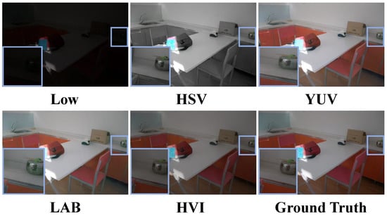 Comparison of different color spaces. In order to justify the choice of HVI color space, we performed multiple color space transformations on the RGB images and decoupled them into illumination components and color components, which were processed using the same network architecture. As shown in Table 9, although the LAB color space is designed to take into account the perceptual characteristics of the human eye on color change, so that its color difference calculation is more in line with human visual perception, the a-axis and b-axis obtained from its decoupling have the problem of difficult color adjustment during model processing, especially in the low-illumination region that is prone to the color bias phenomenon. While the YUV color space was originally designed for video transmission, the chromaticity downsampling technique it adopts effectively reduces the amount of data but inevitably causes the loss of color information. As shown in Figure 10, in the HSV color space, the calculation of the Saturation depends on the Value. When the luminance decreases, the maximum effective saturation of the color will show a nonlinear decay characteristic, which leads to color distortion. Through the comprehensive analysis above, compared to other color spaces, HVI shows superior performance.