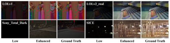 Sony-Total-Dark. This dataset was modified and constructed based on a subset of the SID [], where the training set contains 1866 images captured by sensors under extremely low-light conditions, and the test set consists of 598 images captured at different exposure times, covering various lighting conditions from short-exposure low-light to long-exposure normal-light. To increase the complexity of the task, we processed the raw images by converting them to sRGB format without applying gamma correction, producing significantly darker outputs. We cropped the training images into 256 × 256 patches and trained the model for 1000 epochs with a batch size of 4.