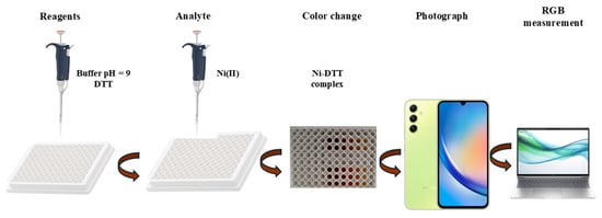 The experimental protocol applied to the proposed analytical process was based on the lack of need for laboratory equipment and specialized personnel and briefly included the addition to each cell of small volumes of (a) the buffer solution for pH regulation (pH = 9), (b) the complexing reagent (DTT, 2.0 µL of 1.0 mol L−1), and (c) the analyte (Νι2+), to a final volume of 300 μL, by the addition of deionized water (Figure 2).