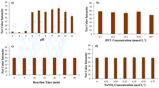 For neutral and mild alkaline pH values, the color change increases significantly, which indicates the complete formation of the Ni-DTT complex, but, for higher alkaline values (pH > 10), a significant decrease was observed, which comes in an agreement with previous findings that reported oxidation of DTT and, as a sequence, decrease in the color intensity [39]. DTT half-life was estimated to be 1.4 h at pH = 8.5 at room temperature, with an additional decrease as the pH value increases [40]. Therefore, a pH value equal to 9 was used in the following experiments.