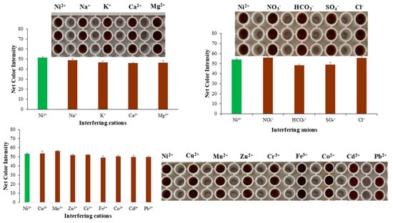 The selectivity of the assay was validated by the determination of ions present in water samples, which possibly hinder the formation of the complex we were studying. Additionally, specific cations that have similar physicochemical properties to Ni(II) were studied to find possible interferences during the complex formation and the performance of the proposed method (Figure 4).