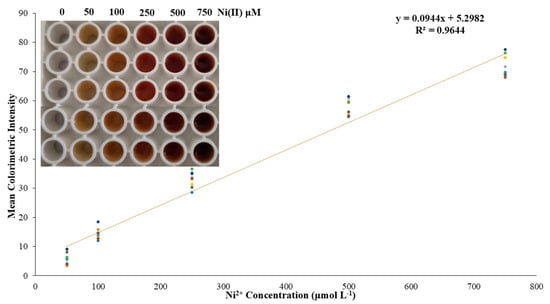 After the determination of the optimum conditions for metal and DTT complexation, as well as studying the selectivity, it was decided to create a series of calibration curves to design a cumulative calibration curve that would consist of many measurements on many different days of conducting the experiments. So, experiments were performed involving five different Ni(II) concentrations, namely, 0.05–0.10–0.25–0.50–0.75 mmol L−1, which is the linear range of the proposed method, since for higher Ni(II) concentrations the color reached a maximum, and the calibration curve reached a plateau. The method can be optimized to improve sensitivity by (a) the use of nanomaterials including AuNPs or AgNPs to induce the color change and enhance the sensitivity of the method; (b) the use of preconcentration techniques including solid-phase extraction (SPE) or liquid–liquid extraction (LLE) to separate and concentrate Ni(II) from the sample matrix before the colorimetric detection, which can significantly improve sensitivity, especially for low concentrations; (c) controlling ambient light interference with a stable light source, using a uniform and stable light source, like an LCD display, as a background for image acquisition to minimize ambient light fluctuations; (d) enclosing the reaction 96-well plate and the smartphone camera within a light-proof chamber that shields the sample from external light sources; and (e) going beyond basic RGB analysis, exploring different color spaces (HSV, CIELab) and novel channel combinations that can significantly improve sensitivity and reduce inter-phone variations during the color changes. Three calibration curves were performed each day, for three consecutive days, providing, through this analytical proposed protocol, a total of nine different calibration curves, whereby a total of 45 measurements of nickel concentrations were determined. The average colorimetric intensity measurements of the three days are shown in the accumulated calibration curve presented in Figure 5.