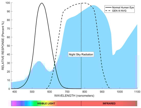 Consequently, optimal LED spectral selection necessitates integrated consideration of the interrelationship between human visual perception, NVG spectral response characteristics, and night-sky radiation profiles. To establish the analytic framework, we referenced three datasets: the photopic luminosity function standardized by the Commission Internationale de l’Éclairage (CIE) for human spectral sensitivity [41], the NVG response characteristics codified in U.S. Department of Defense specification MIL-STD-3009 [42], and the night-sky irradiance distributions documented by Vatsia et al. [43]. Comparative spectral diagrams (380–1100 nm wavelength, Figure 1) delineate correlations between night-sky radiation, human perceptual thresholds, and Generation III NVG spectral sensitivity.