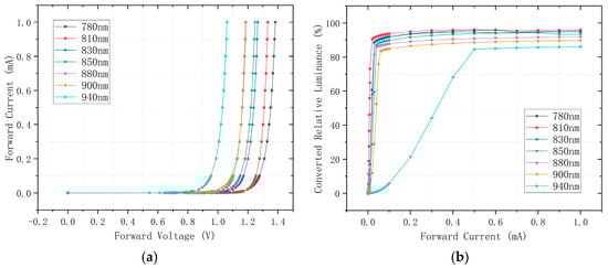 Current-voltage characteristics and irradiance-to-current response curves of ultra-low current NIR-LEDs: (a) current-voltage characteristics; (b) irradiance-to-current response under NVG-coupled measurement.