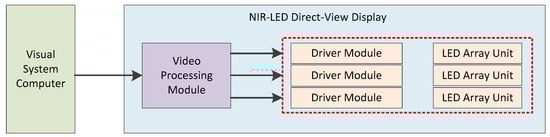 Building upon the established spectral and LED selection rationale, this section details the implementation of the system hardware design. For direct-view displays utilizing 940 nm NIR-LEDs (Dongguan Lanjin Optoelectronics Co., Ltd., Dongguan, China), this work proposed an optimized hardware architecture comprising three core components: a video processing module executing RGB-to-grayscale conversion, luminance regulation, gamma correction, image segmentation/distribution, and video interface adaptation; a driver module paring image data into scanning control signals; and an LED array unit (Figure 3) comprising matrix scan driver ICs and LED devices that convert control signals into PWM signals. In practical implementations, display panels are composed of multiple tiled LED array units. A single driver module typically controls multiple arrays, with its load capacity determined by pixel count, grayscale depth, and refresh rate. Video processing module configuration scales with display resolution, requiring only one module for systems at or below 4K resolution (3840 × 2160).