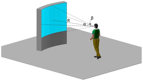 During simulation training with pilots positioned 2.5–3.5 m from the display, this design ensures high-definition imagery by first determining pixel pitch based on spatial resolution (arcmin/pixel), then defining resolution, and finally establishing screen dimensions. Although 1 arcmin/pixel (60 ppd) delivers optimal visual acuity, established LED display engineering practice confirms resolutions ≤2 arcmin/pixel (30 ppd) maintain excellent visual quality while substantially reducing hardware resource demands and power consumption [44,45,46]. Accordingly, this implementation adopted a 1.25 mm pixel pitch with 1280 × 1024 resolution. For a cylindrical screen configuration of radius R = 2500 mm, this yields a horizontal field of view (HFOV) of 32.62° and vertical field of view (VFOV) of 28.72°, achieving a calculated spatial resolution of 1.72 arcmin/pixel––delivering high-definition NVG-compatible imagery. The finalized NIR-LED direct-view display rendering is demonstrated in Figure 4.
