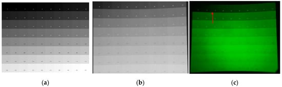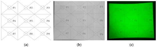 where denotes display uniformity and and represent maximum and minimum luminance among the nine test points, respectively. Given the display’s 940 nm emission wavelength, infrared irradiance measurement replaced luminance for performance characterization. Darkroom measurements employed a CAS140CT-156 spectroradiometer with EOP146 probe in direct screen contact, with test images depicted in Figure 9. Figure 9a shows the designed test pattern (1280 × 1024), matching the resolution of the NIR-LED direct-view display to ensure pixel-to-pixel rendering. Figure 9b presents the infrared camera capture, confirming high sharpness and faithful imaging under point-to-point mapping. Despite lower resolution due to sensor limitations, Figure 9c shows that the NVG-resolved image remains discernible, with clear edges and legible text, indicating adequate resolution performance for practical NVG simulation.