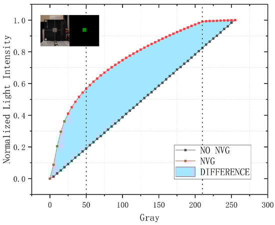 Both curves in Figure 6 exhibit monotonic increase from 0 to 1, yet the NVG-observed curve consistently exceeds direct measurements in normalized values, confirming NVGs’ irradiance amplification throughout the input range. This enhancement is particularly pronounced at low irradiance (grayscale 0–50), indicating enhanced NVG responsivity under diminished irradiance. Conversely, in high-irradiance regions (grayscale 210–255), NVG-observed outputs demonstrate minimal increments with progressive stabilization, confirming asymptotic convergence toward saturation in this region. Mid-irradiance zones approximate linearity. These observations establish that NVGs exhibit inherent non-linear response characterized by low-irradiance enhancement and high-irradiance compression.