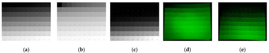 Gamma compensation comparative results: (a) original grayscale test chart; (b) γ = 0.35 compensated rendering; (c) γ = 2.85 compensated rendering; (d) NVG-captured image of original display; (e) NVG-captured image after γ = 2.85 screen compensation.