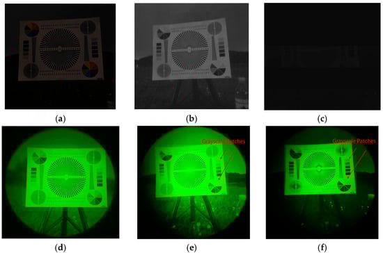 Night vision scene rendering comparison of NIR-LED display: (a) reference night scene 2; (b) infrared-camera-captured display output (γ = 1); (c) infrared-camera-captured display output (γ = 2.85); (d) NVG-captured reference scene 2; (e) NVG-captured display output (γ = 1); (f) NVG-captured display output (γ = 2.85).