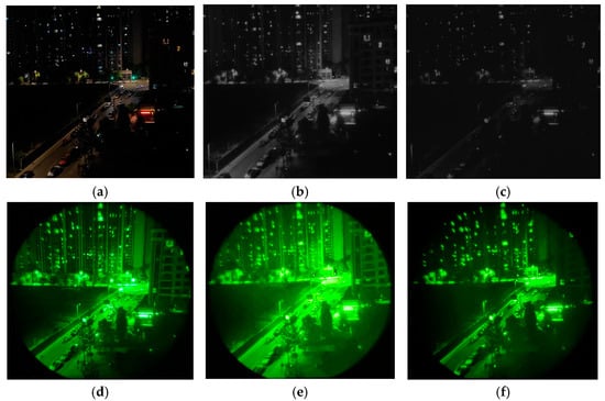 Night vision scene rendering comparison of NIR-LED display: (a) reference night scene 1; (b) infrared-camera-captured display output (γ = 1); (c) infrared-camera-captured display output (γ = 2.85); (d) NVG-captured reference scene 1; (e) NVG-captured display output (γ = 1); (f) NVG-captured display output (γ = 2.85).