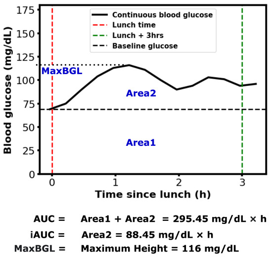 11]. However, temporary elevations above this range are common following certain meals. The area under the BGL curve during a specific post-meal period (e.g., 2–3 h) is referred to as the postprandial Area Under the Curve (AUC). Postprandial blood glucose and AUC are important indicators of BGL regulation and diabetes complications [