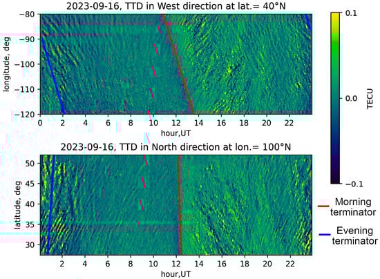 Travel-time diagram of TEC variations on 16 September 2023 drawn along 40° N parallel (top) and along 100° W meridian (bottom). Morning and evening terminators at the ground level are indicated, respectively, by red and blue lines.