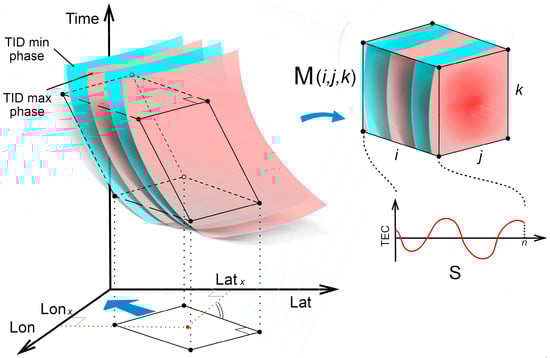The propagating TID will appear in space-time as several parallel two-dimensional inclined planes of alternately increased and decreased TEC values, as displayed in Figure 2, corresponding to in-phase regions. The tangent of the angle between the plane and the time axis is equal to the phase velocity of TID, and slope orientation in spatial plane corresponding to propagation direction.