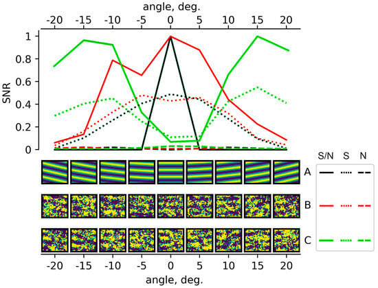 In essence, the proposed method of calculating the signal to noise level is probably the simplest and most obvious way to search for wave or any inhomogenous structures in three-dimensional (two spatial coordinates and one time) data. Let us give an example of testing the signal/noise calculation using synthetic harmonical data. Figure 3 shows slices of the M array in the «ij» plane (lower panel) for different angles and for three types of synthetic data (A, B, C). The upper panel shows the values of the calculated signal/noise ratio. The synthesized data in Figure 3 are as follows: